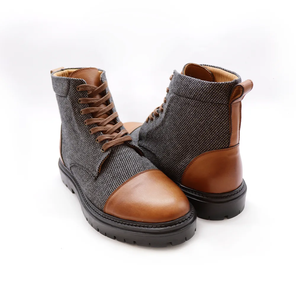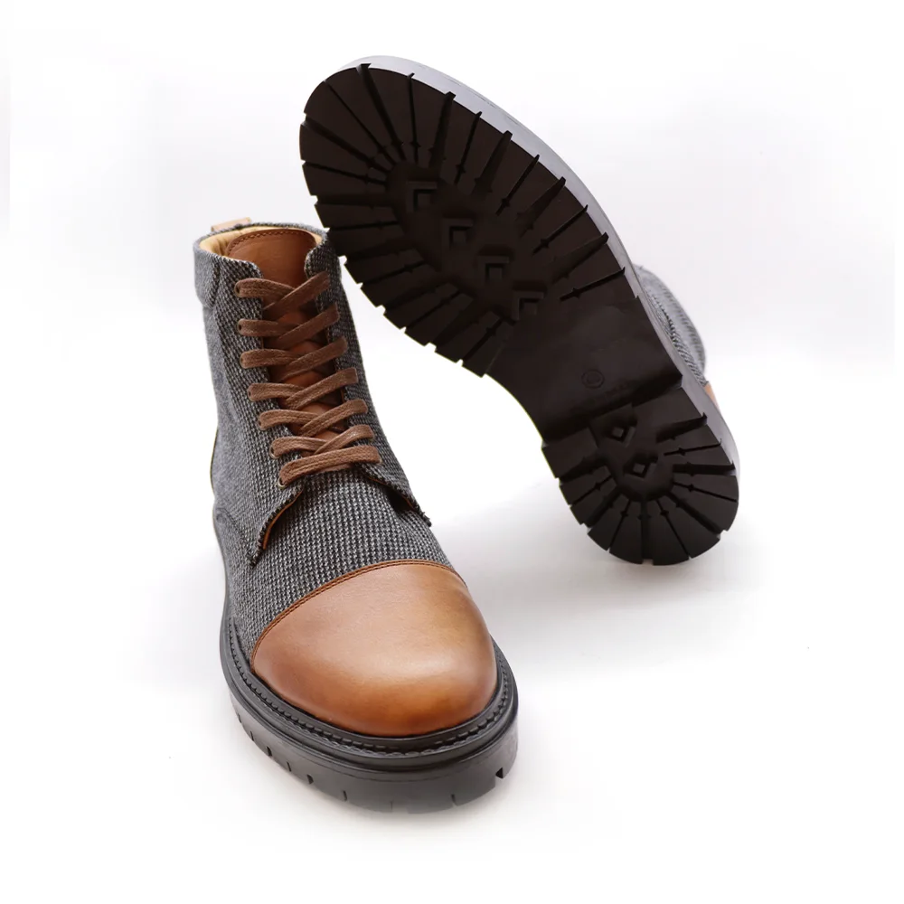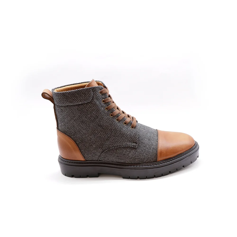 Los botines caoba para hombre ZAR 10 de Adriano combinan elegancia y modernidad en un solo diseño. Confeccionados en cuero natura color caoba y detalles en textil gazaba con cuadros en negro, estos botines ofrecen un contraste visual único y refinado.